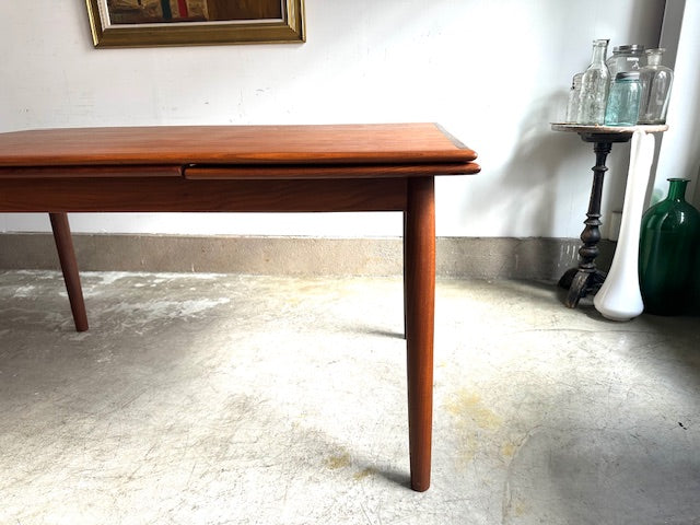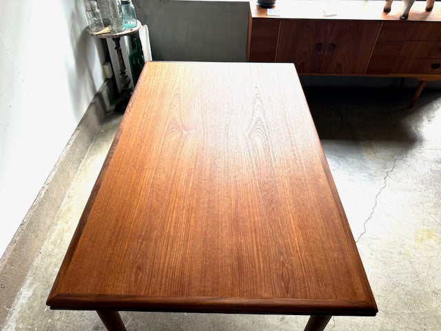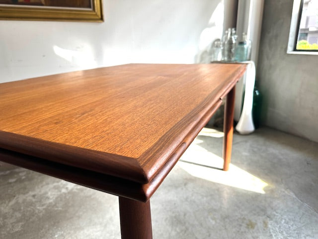 天板にはチーク、縁や脚部にはアフロモシアを使用しており、木部のコントラストが美しく印象的な一台。