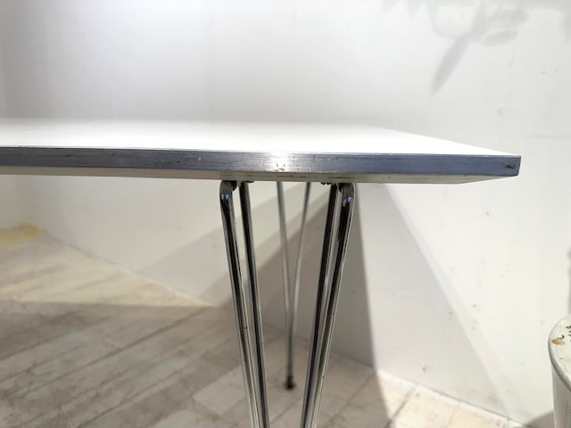 白い天板にぐるりと回るアルミエッジ、そして軽やかなクローム脚の組み合わせがとてもモダンで、空間にすっきりとした明るさを添えてくれます。