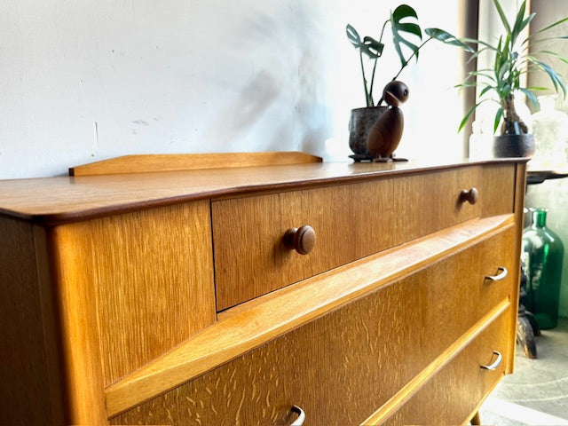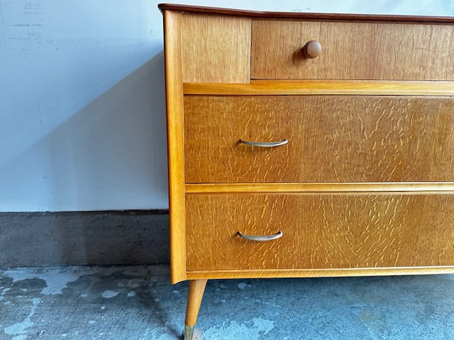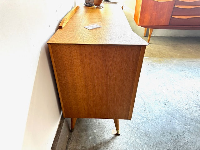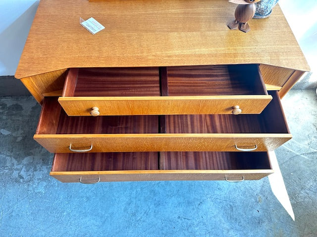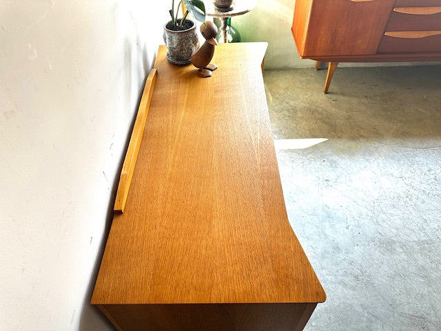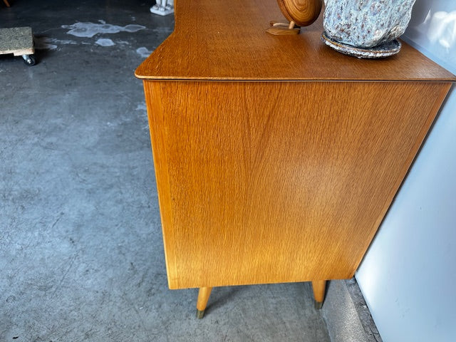 1960年代イギリス製のチェストです。前面の独特なフォルムが目を引きますが、脚先にも真鍮色のカバーがされていて天板も独特な形でアクセントのある目を引くデザインです。