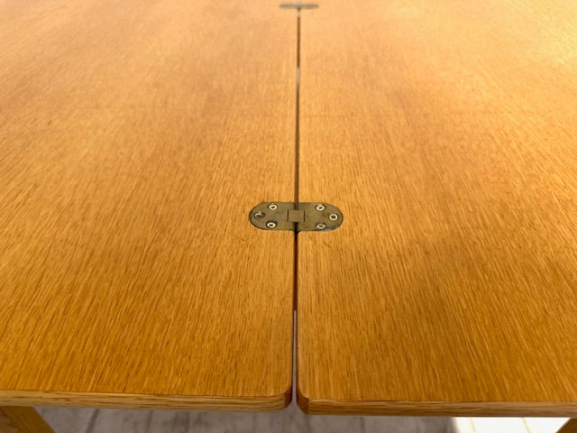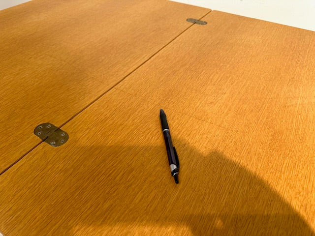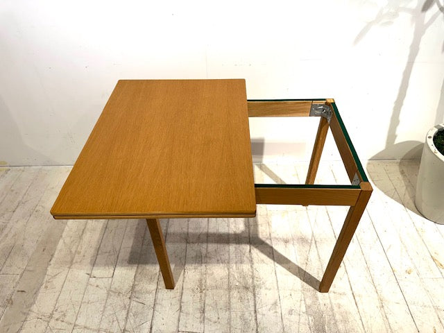 伸長方法が珍しい造りで、天板を90度回転させた後に本を開くように広げるタイプ。