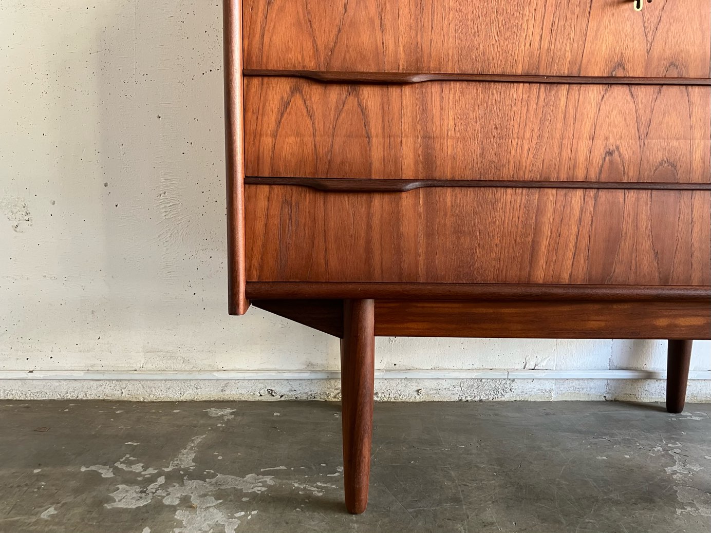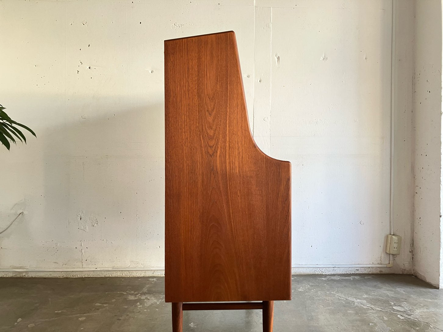 サイドのなめらかな曲線、すっと伸びた丸脚、削り出しの把手等細かながら見どころも多い。