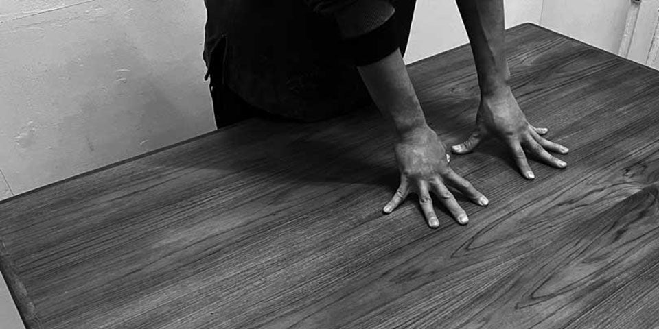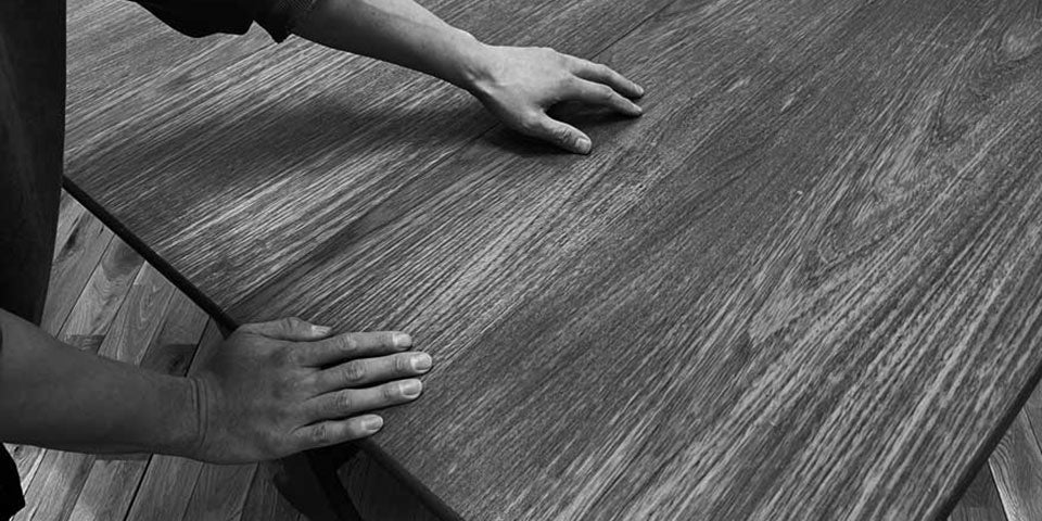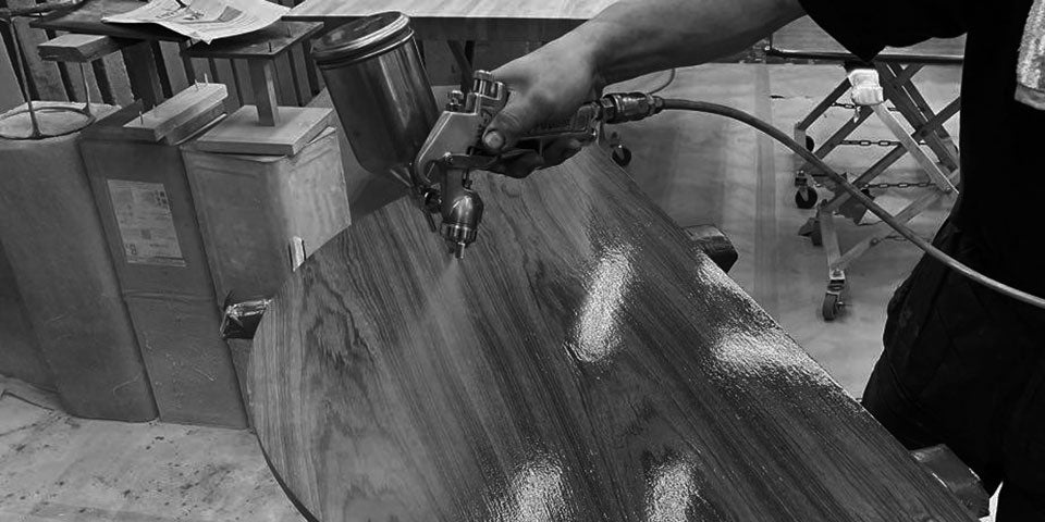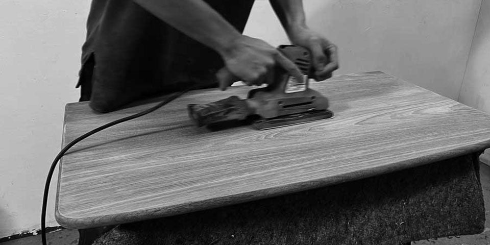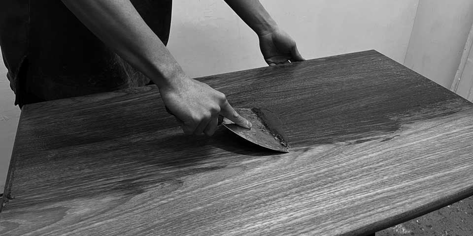 傷や欠け、凹みは同質木材やパテで補修をしてから電動サンダーや紙やすりを使い、荒めの番手から細かい番手に段階的に研磨して素地を整えます。平面、曲面共にサンダーの後に手追いをすることで滑らかで肌触りの良い仕上がりとなります。