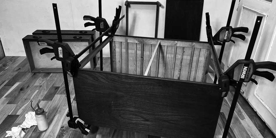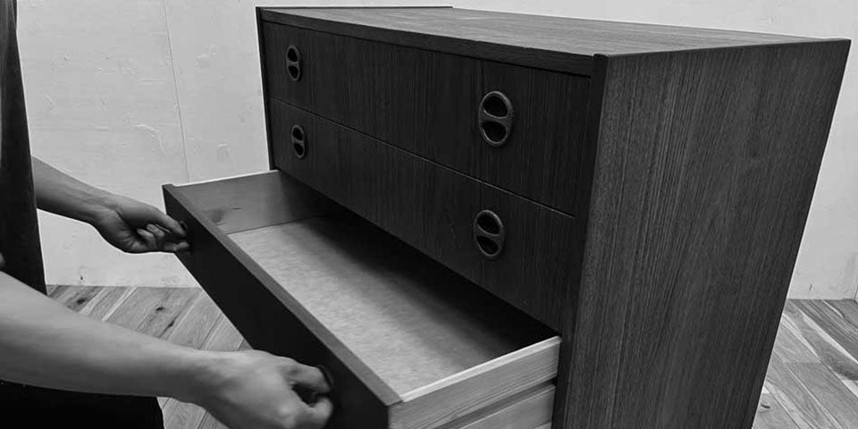 箱などの内部や底裏面や背面のクリーニング、必要に応じて底板材等の交換、 金属類の磨きを行ってから塗装を終えた各部材の組立て、収まりの確認を行います。扉や抽斗のスムースな開閉の為の微調整やテーブルなどの軋み音が無いかの確認と解消を行って完成となります。